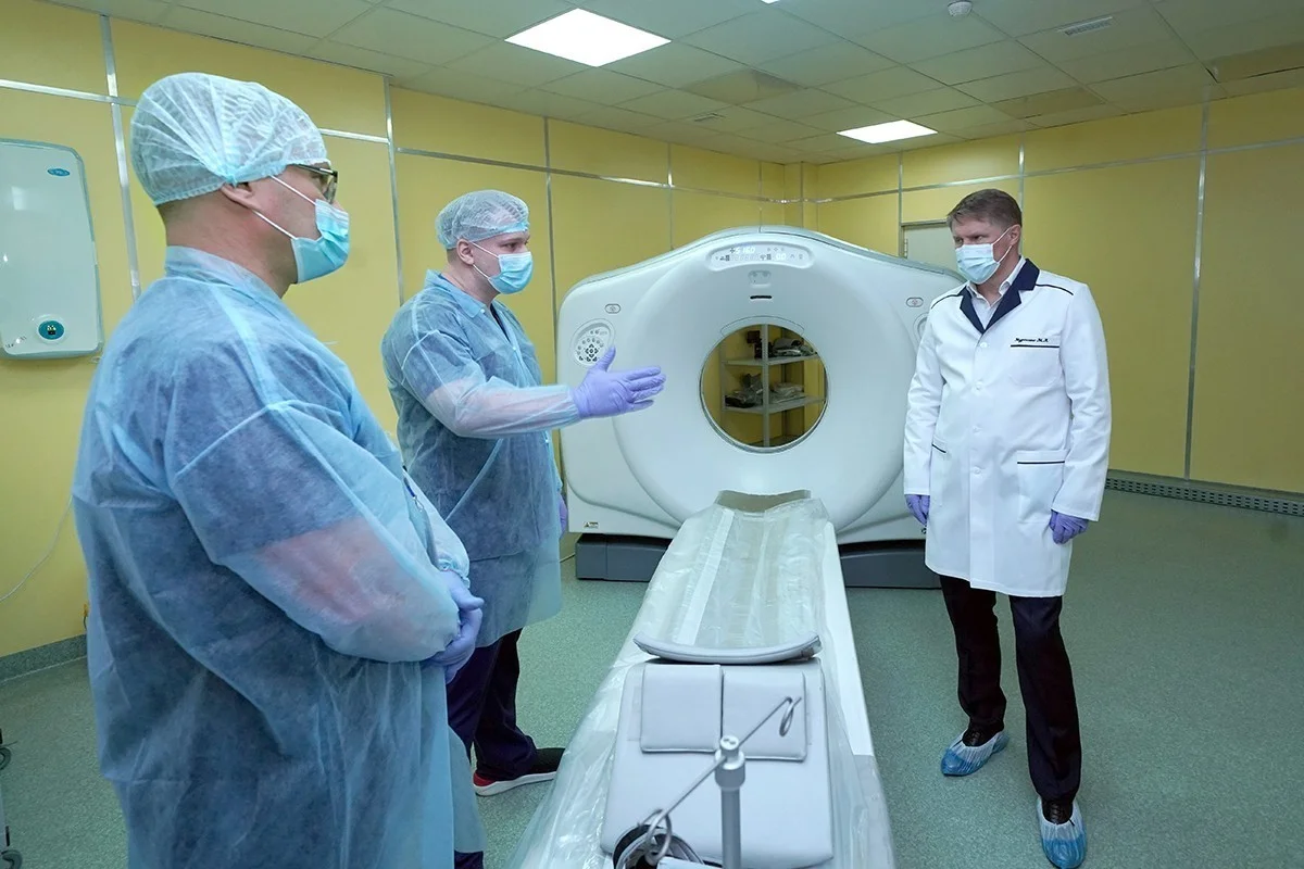 Рабочий визит Александра Гуцана и Министра здравоохранения РФ Михаила Мурашко начался с обхода Калининградской областной клинической больницы, где оказывается плановая и экстренная помощь. Они ознакомились с работой приемного покоя, осмотрели кабинет компьютерной томографии, где установлено оборудование в рамках нацпроекта «Здравоохранение», и палату реанимации сердечно-сосудистого центра.