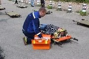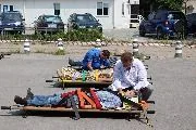 Первый этап учебной тренировки проводился на территории Городской станции скорой медицинской помощи. По легенде, на одной из трибун стадиона, на которой размещались болельщики, произошло обрушение. На место происшествия незамедлительно прибыла 44-я бригада ГССМП, которая определила степень тяжести десяти «пострадавших», извлеченных «из-под обломков», и в соответствии с ней - очередность эвакуации.
